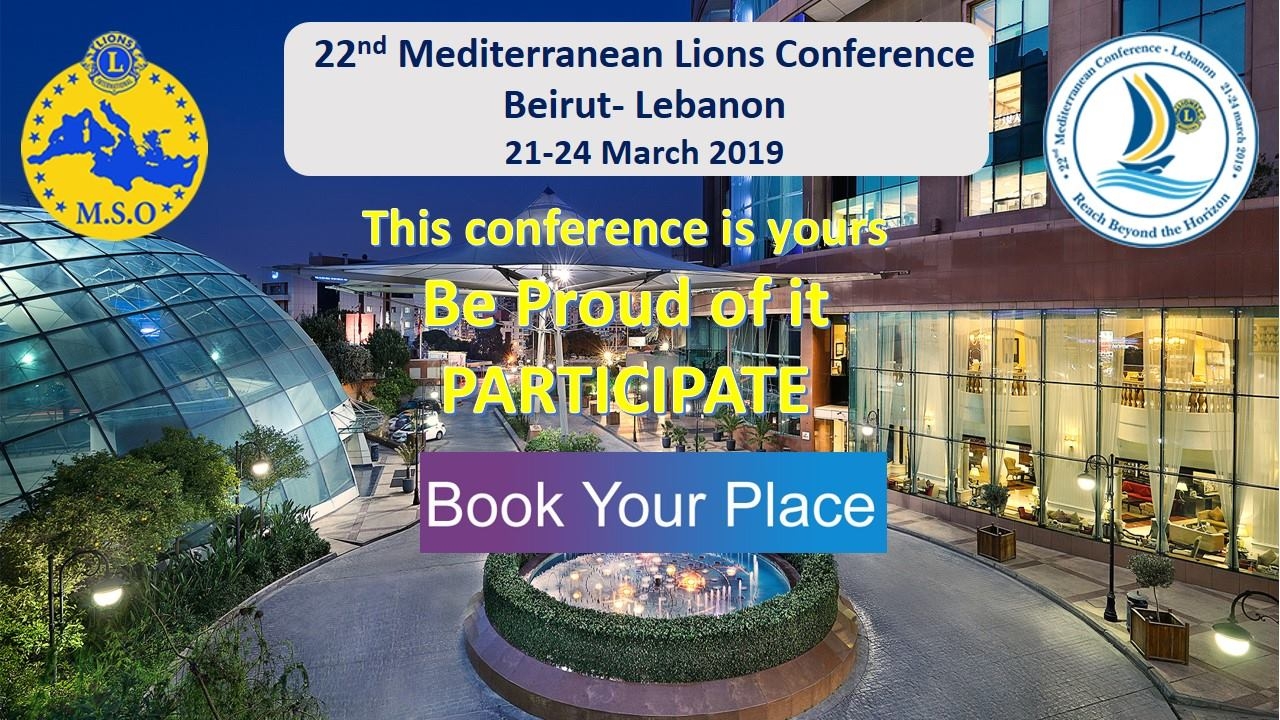 يتشرف رئيس اللجنة المنظمة لمؤتمر البحر المتوسط، الحاكم السابق الليون المهندس سمير ابو سمره بدعوتكم للمشاركة في هذا المؤتمر الذي سينعقد في بيروت - لبنان من 21 الى 24 آذار 2019 في فندق الحبتور، باستضافة المنطقة 351.